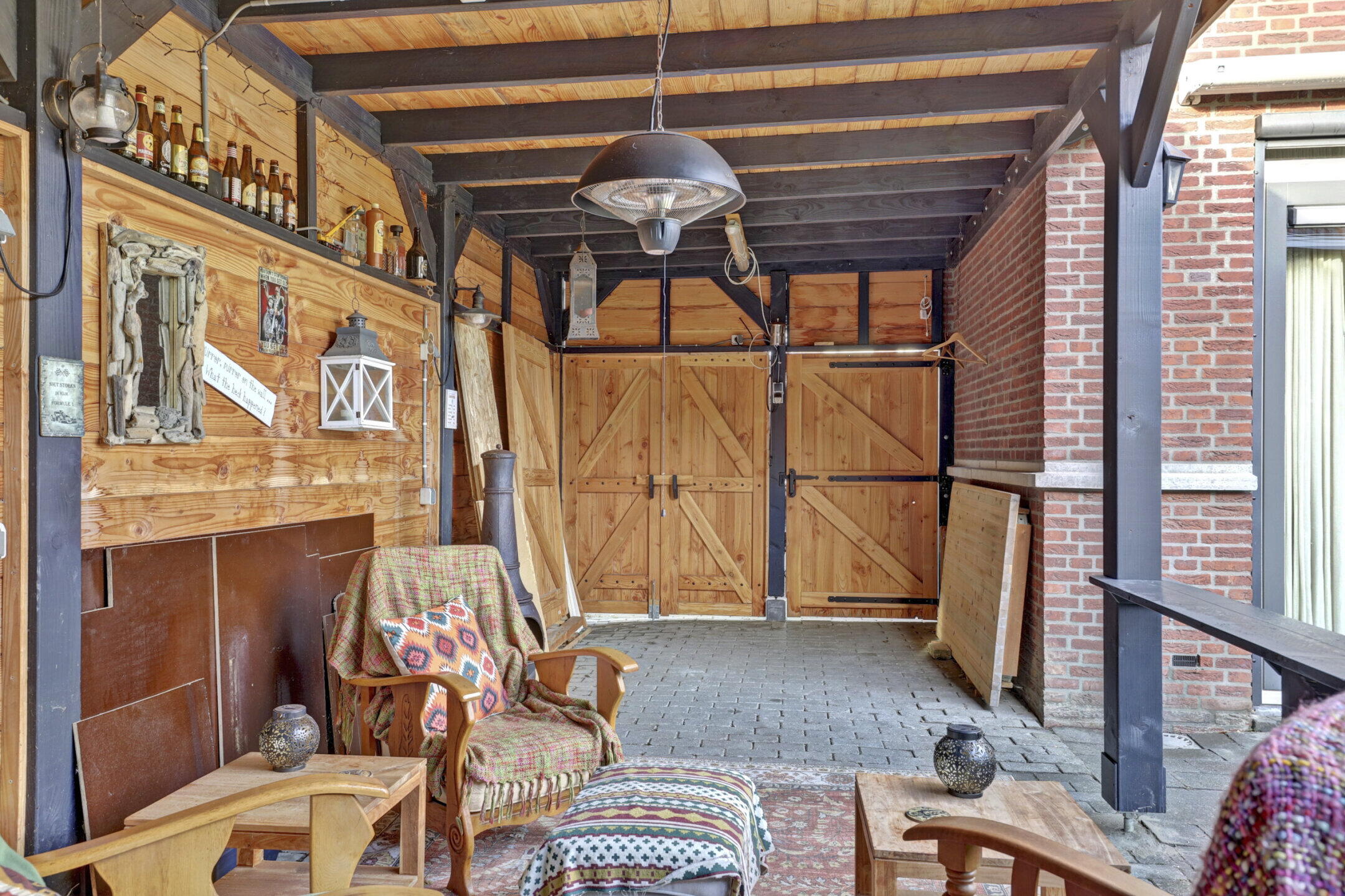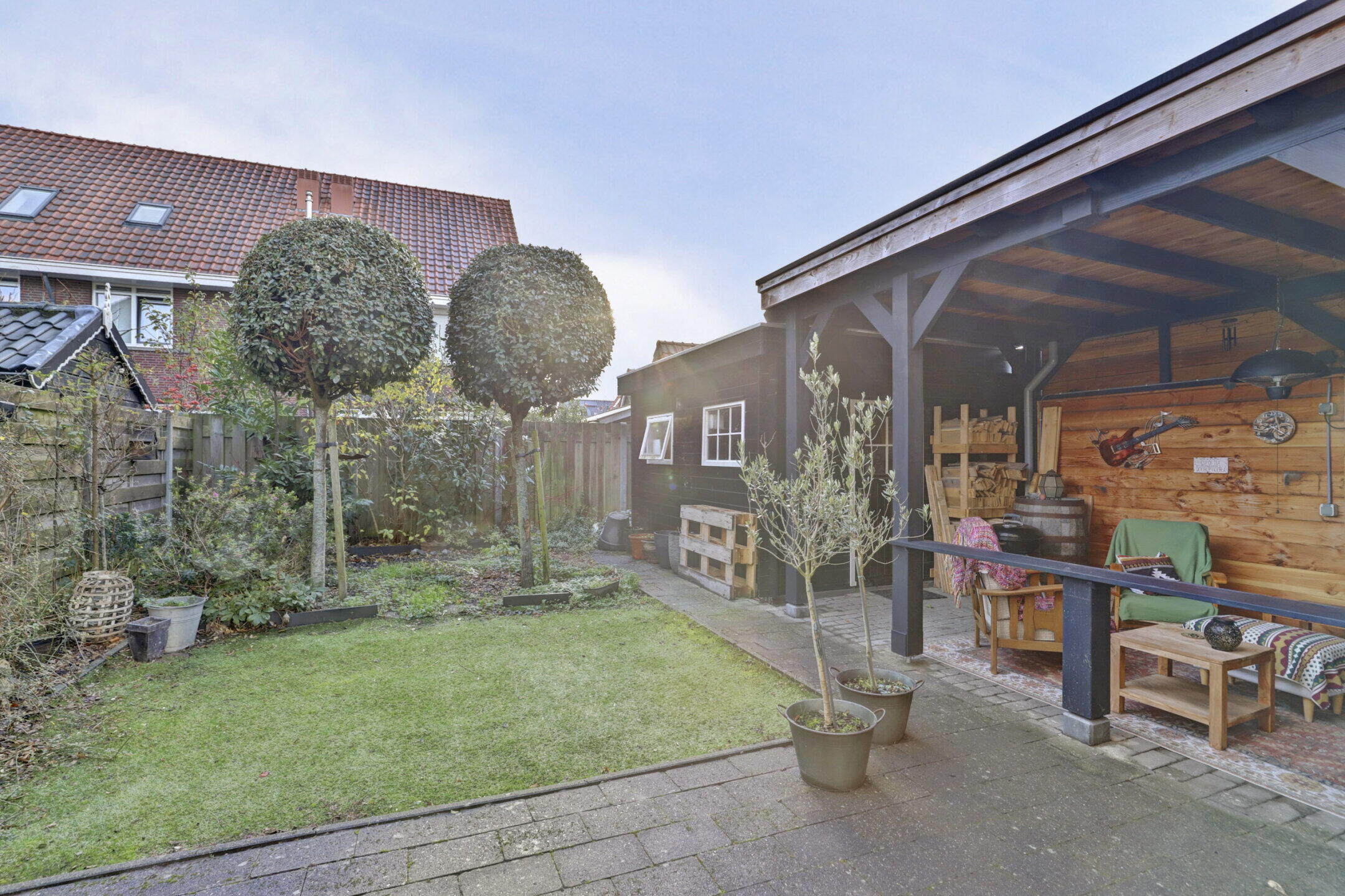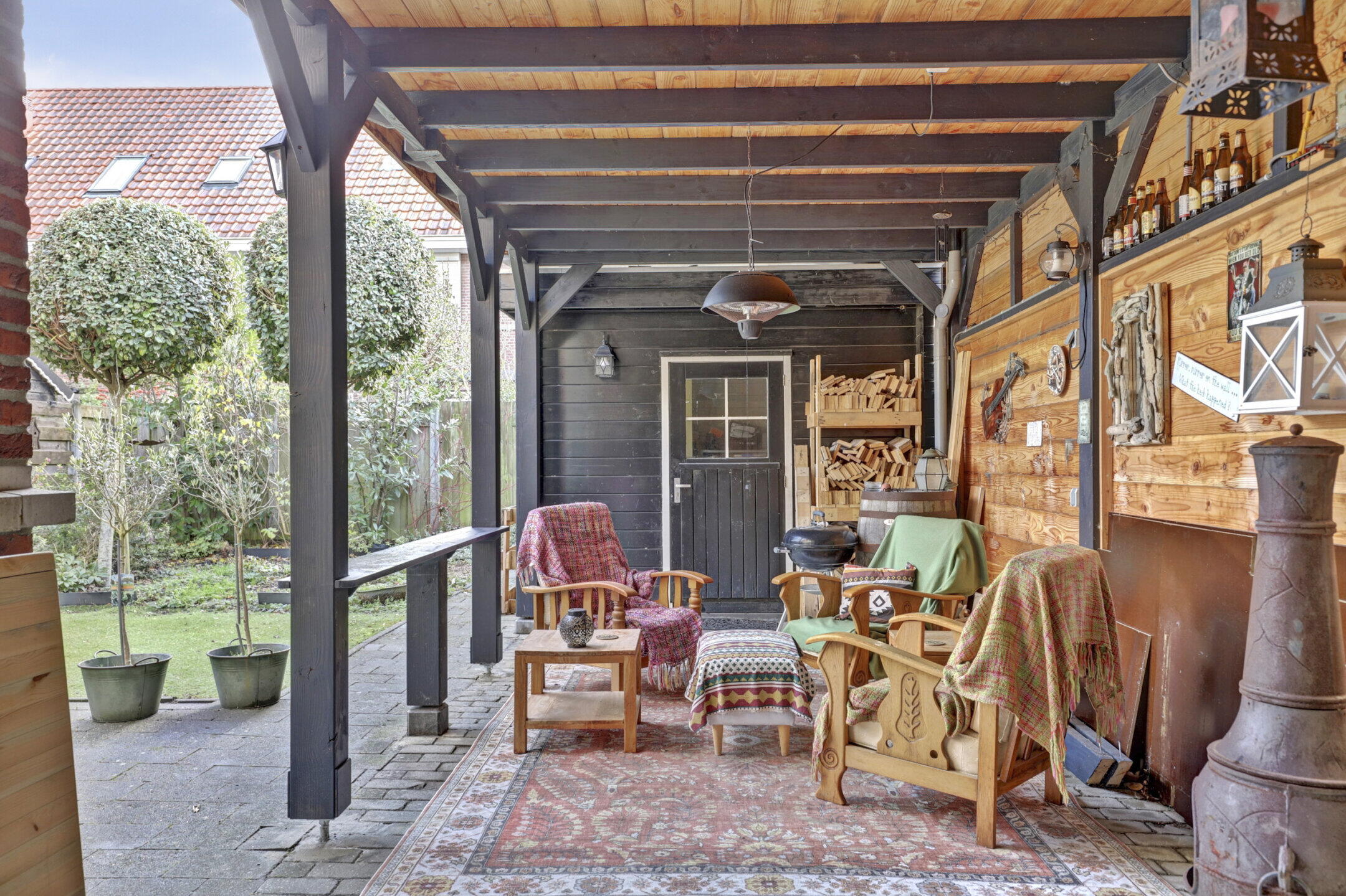 De achtertuin is eveneens netjes aangelegd, uitgevoerd met een grote overkapping en heeft een goede bezonning gedurende de hele dag. Daarnaast is er de berging van zo'n 10 m2. De oprit biedt plaats voor meerdere auto's.